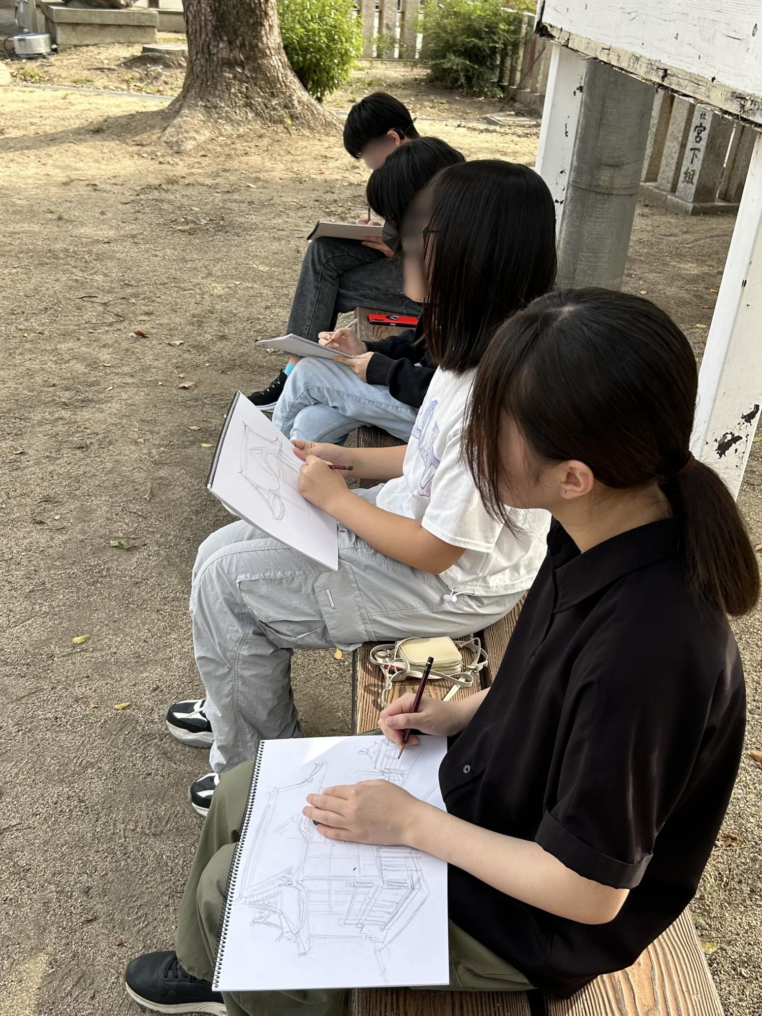 「今日は筆と色鉛筆が主役!」そんな声が聞こえてきそうな秋の日、Gakken高等学院中等部の生徒たちは、学校のすぐ近くにある粟津神社へ写生に出かけました。