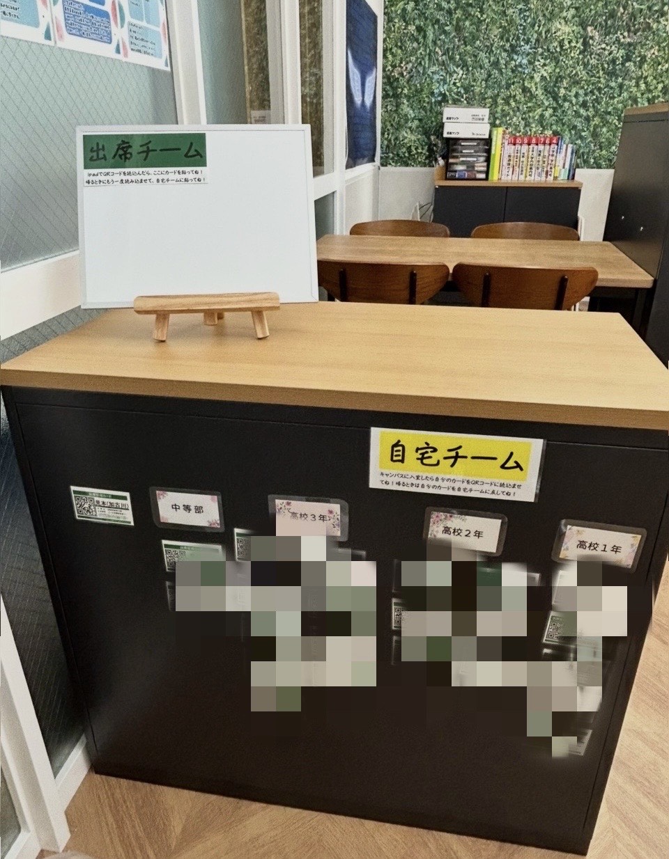 加古川キャンパスでは、登校したら「自宅チーム」に貼ってある自分の名前を