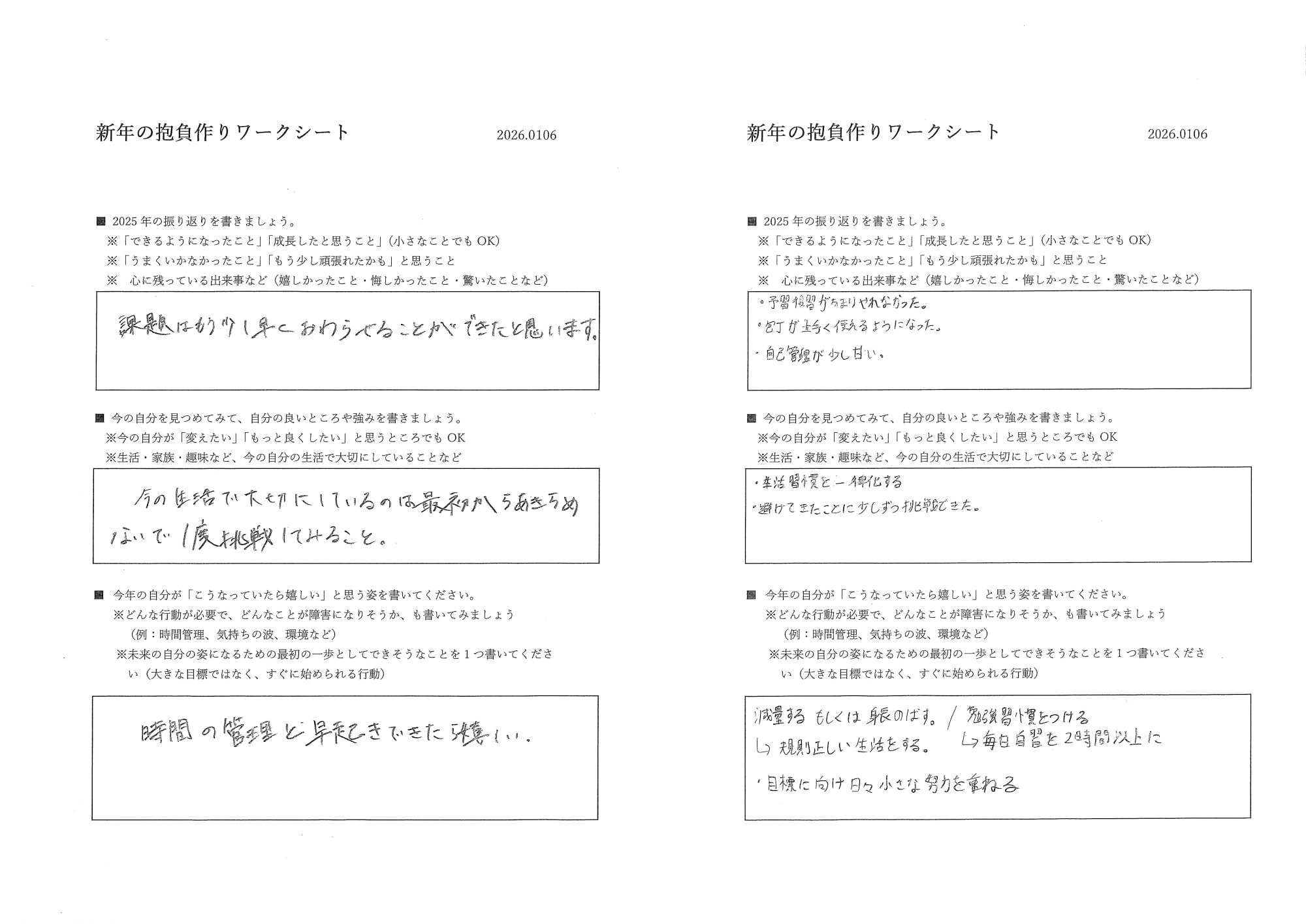 新年最初のホームルームでは、1年のスタートにふさわしい時間として、生徒のみなさんに「今年の抱負」を考えるワークに取り組んでもらいました。