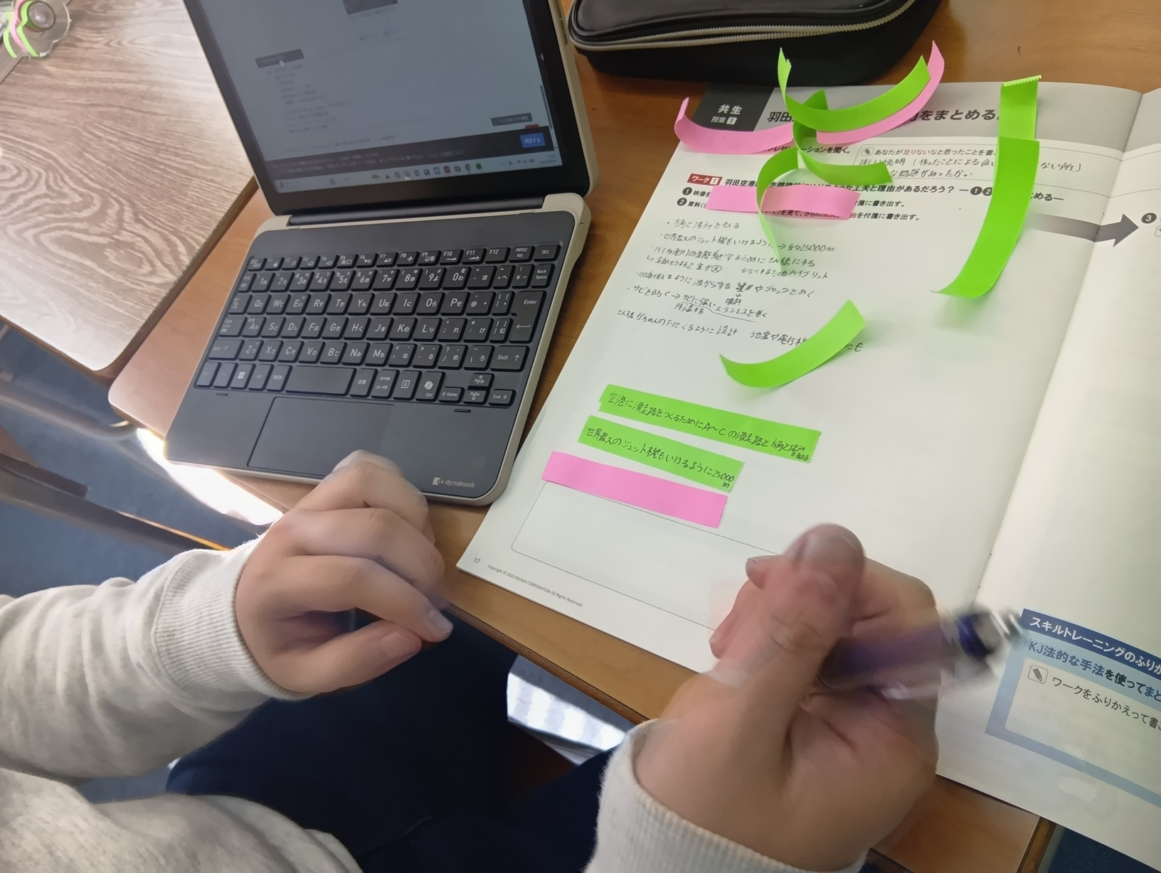 まず、生徒たちはD滑走路の特徴や建設に至る工夫・理由を調べ、気づいた点を付箋に書き出しました。