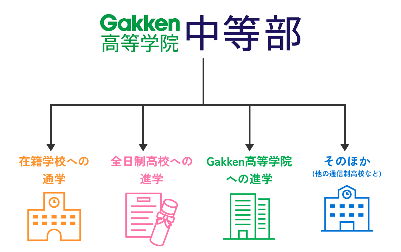 Gakken高等学院中等部での学習・仲間と過ごす体験など、いろいろな活動を通して、未来を考えていけるように導きます。高校への進学はもちろん、在籍学校への通学やそのほかの学び方の選択もサポートします。