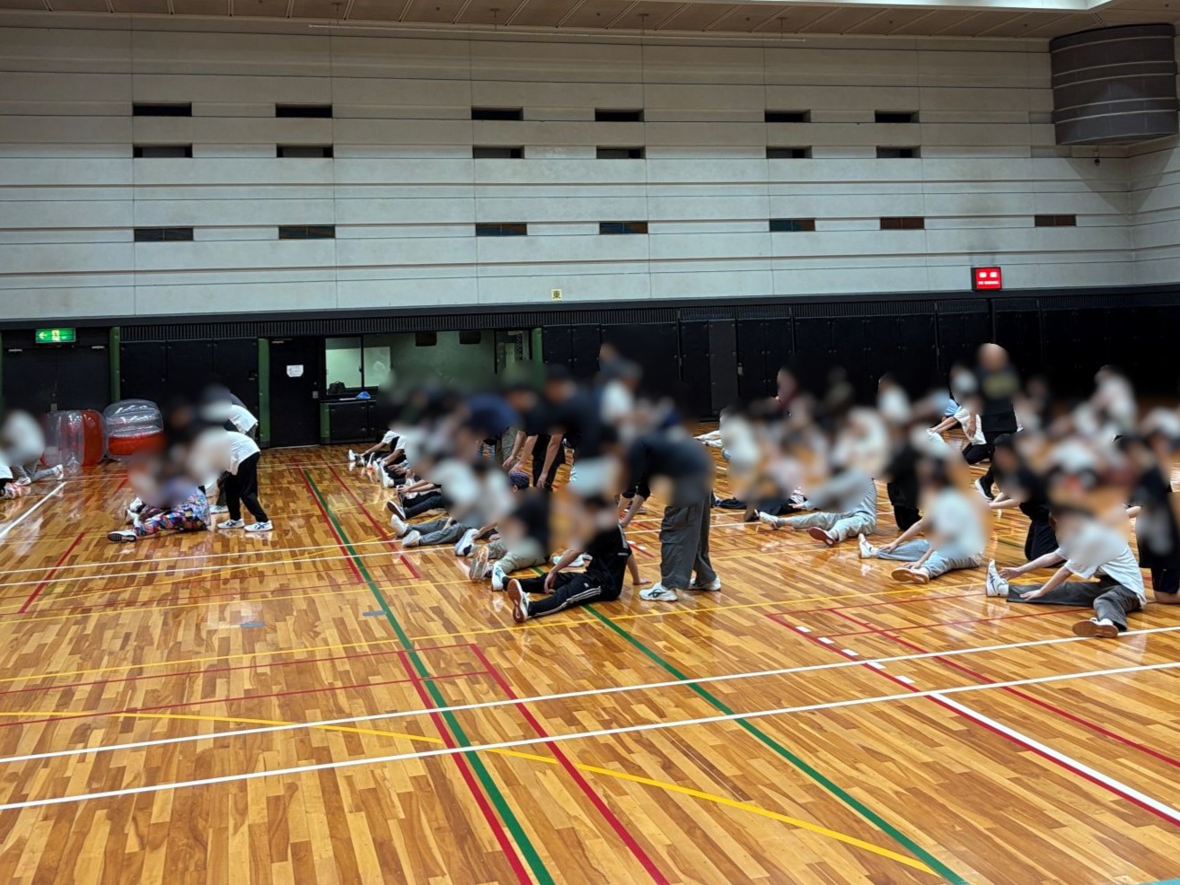 体育館に集まった生徒たちは、先生のかけ声に合わせて体を大きく動かし、心身をしっかりほぐしていきました。普段はそれぞれの学習スタイルで過ごしている生徒たちも、この日は一体感を持ちながらリズムよく体を動かし、自然と笑顔が広がっていきました。