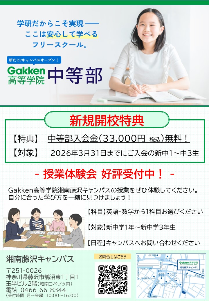 Gakken高等学院中等部湘南藤沢キャンパスでは、「個別相談会」や「授業体験会」をご案内しております。