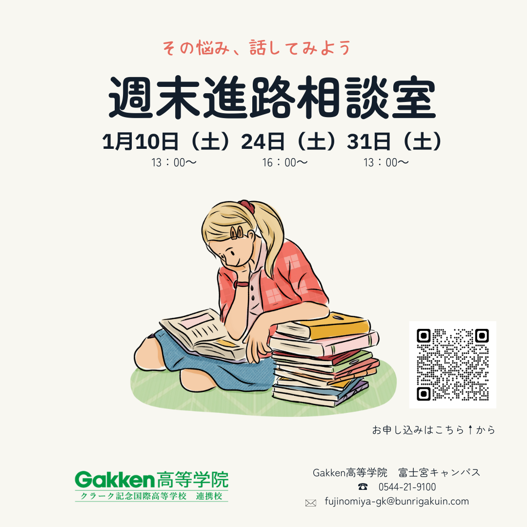 など相談の内容は、生徒それぞれ異なります。Gakken高等学院富士宮キャンパスなら、そんな生徒ひとりひとりの声に丁寧に耳を傾け、当キャンパスならどうサポートできるかを一緒に考えます。今の高校に不安のある方、通信制高校のことをまず知りたい方も、週末進路相談会にお越しくださいませ。