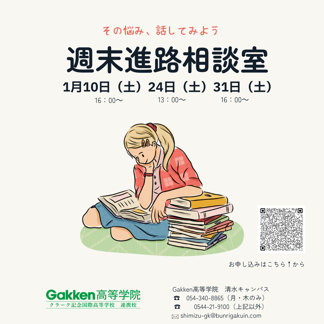 など相談の内容は、生徒それぞれ異なります。Gakken高等学院清水キャンパスなら、そんな生徒ひとりひとりの声に丁寧に耳を傾け、当キャンパスならどうサポートできるかを一緒に考えます。今の高校に不安のある方、通信制高校のことをまず知りたい方も、週末進路相談会にお越しくださいませ。