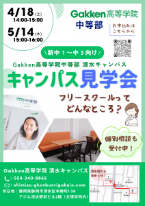 まずはお気軽に、キャンパスをのぞきにお越しください。そして、「キャンパスで過ごしてみる」ことを体験してみてください。キャンパスで自分の好きなことをして過ごしてみましょう。何もしなくても大丈夫です。イスに座ってボーっとするのも、好きな本を読むのも、先生たちとゲームやおしゃべりするのも、大切で必要な時間です。Gakken高等学院中等部清水キャンパスは少人数制ですので、自分らしく安心して過ごすことができますよ。春休みの時間を使って学び直しをするのもいいですね。学習面のサポート体制もバッチリですのでご安心ください。