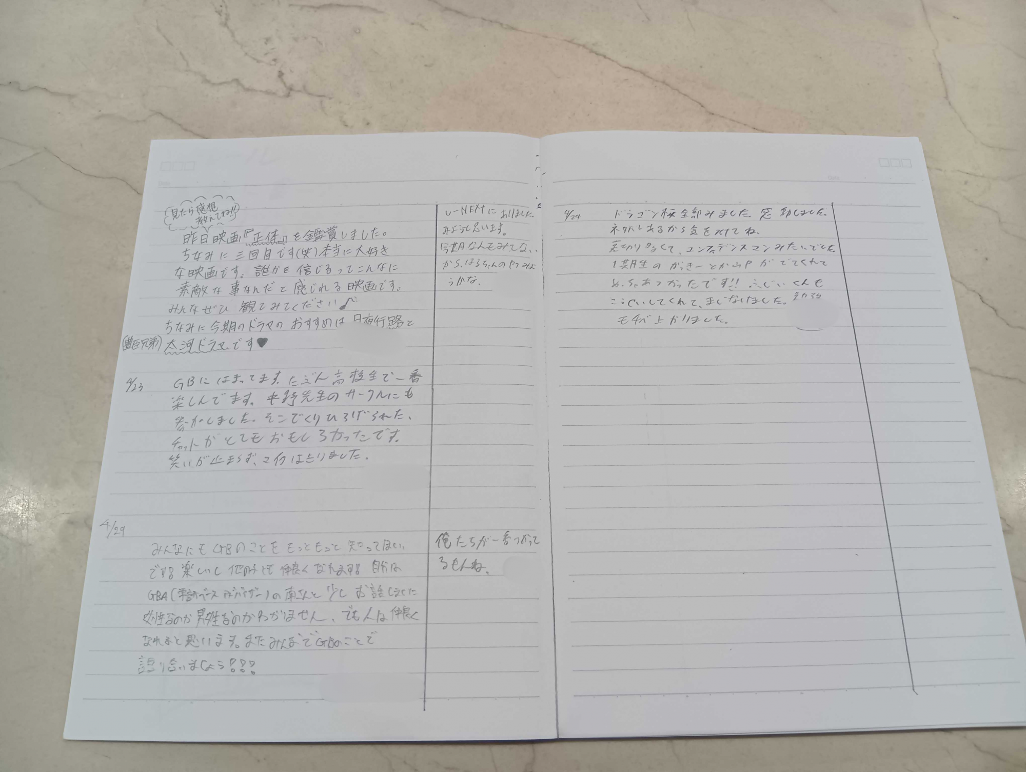 ノートには、最近観た映画の感想やオンラインキャンパスGakkenBaseの話などの内容が綴られています。