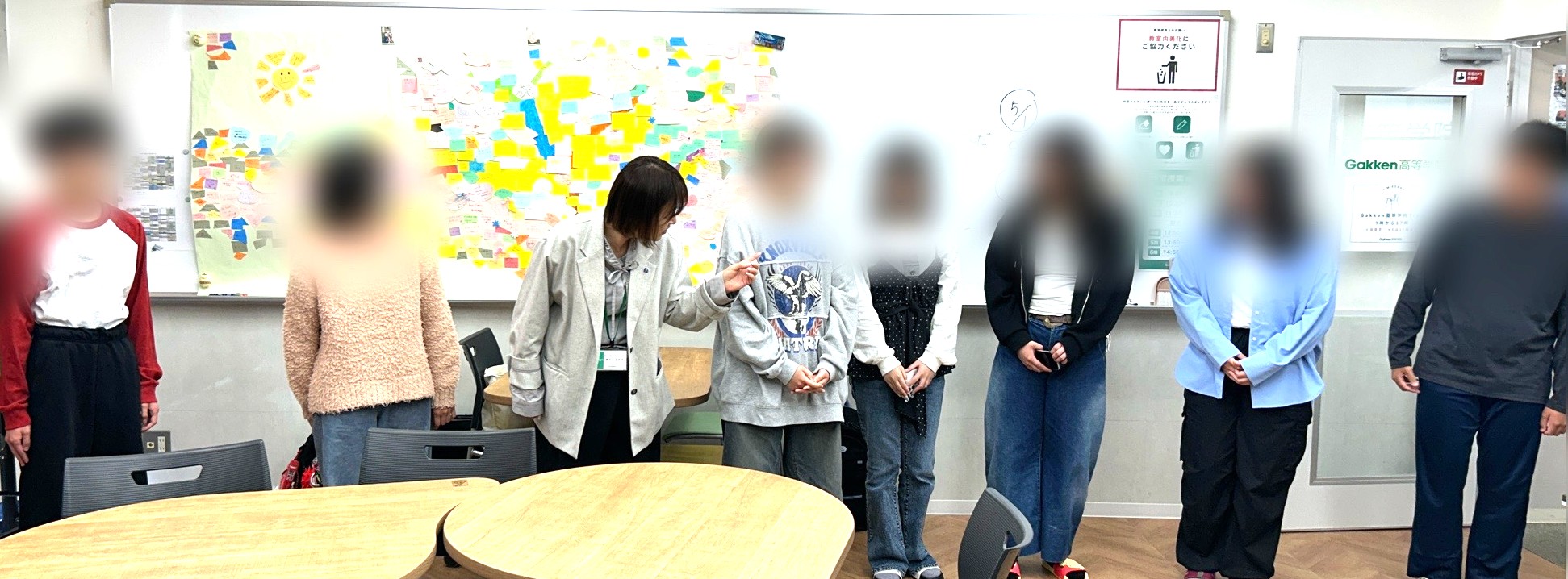 まずは練習として「ノンバーバルコミュニケーション」をみんなでやってみます。言葉以外の要素、たとえば表情、視線、身振り、などを通じて考えを伝えるコミュニケーション手法です。